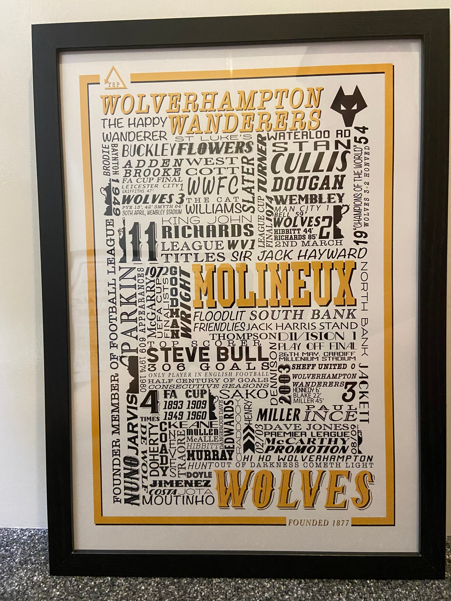 A perfect gift for Christmas, Birthdays or Fathers Day for a Wolves fan to proudly hang on the wall.