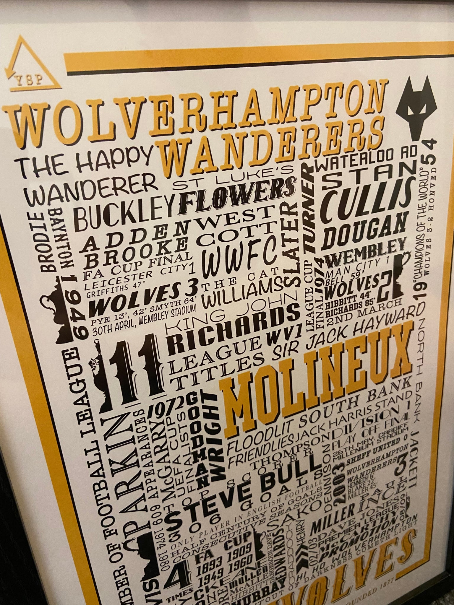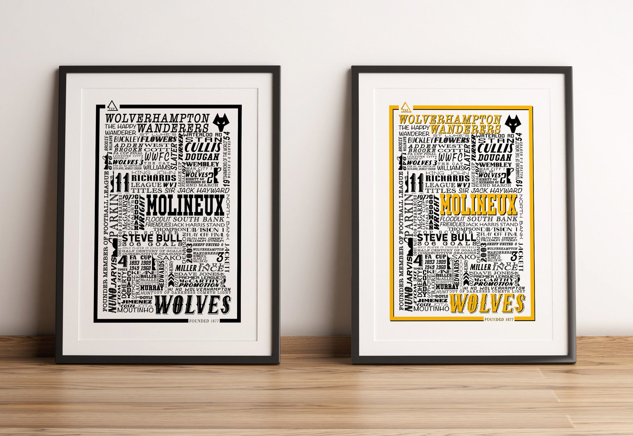 This Wolves Football History Print celebrates the rich history of Wolverhampton Wanderers Football Club and their story. Honours won, classic matches, unforgettable moments, fan favourite players, club legends and successful managers throughout the years.
