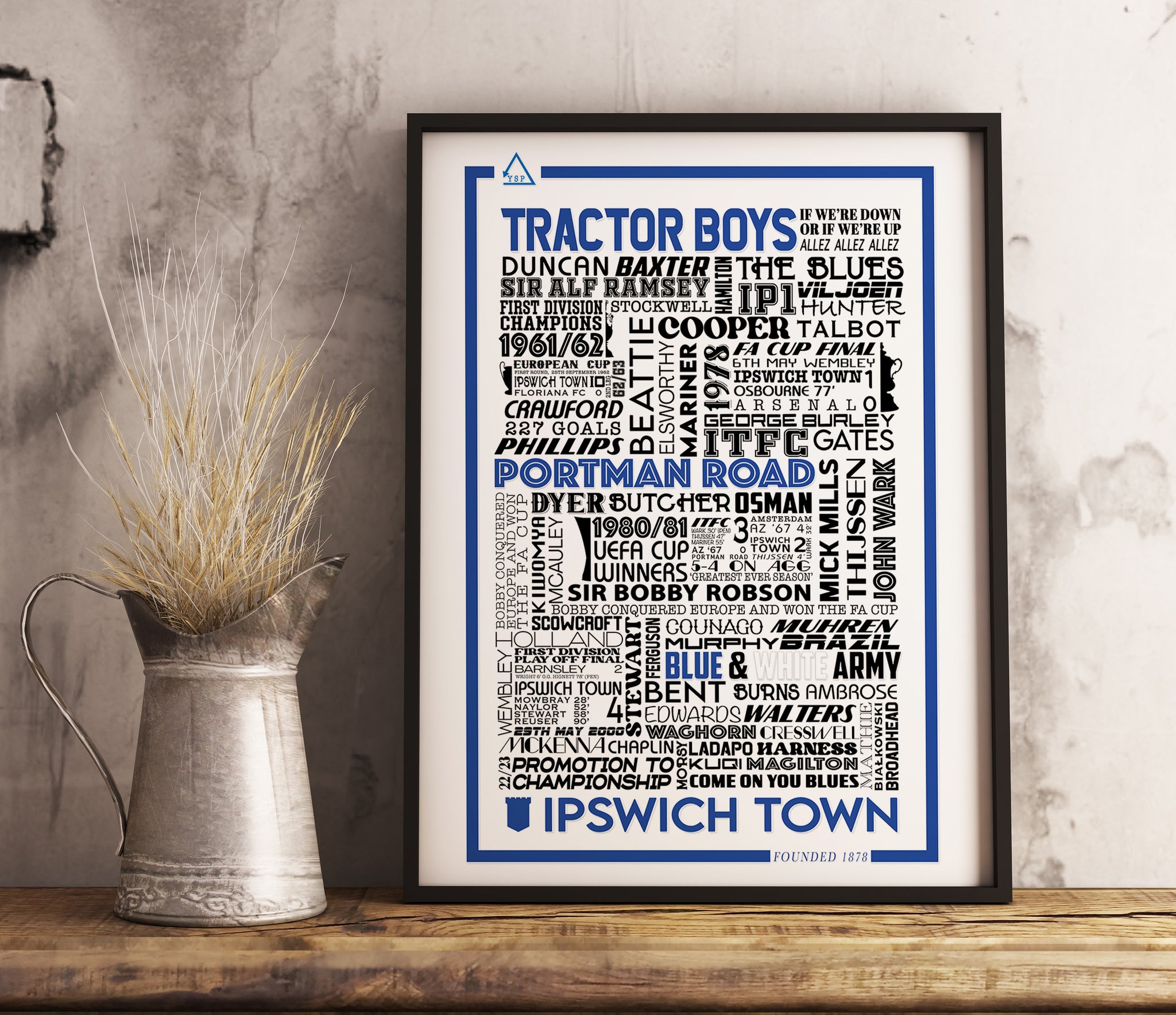 Ipswich Town Football History Print celebrates the rich history of Ipswich Town Football Club and their story. Honours won, classic matches, unforgettable moments, fan favourite players, club legends and successful managers throughout the years.
