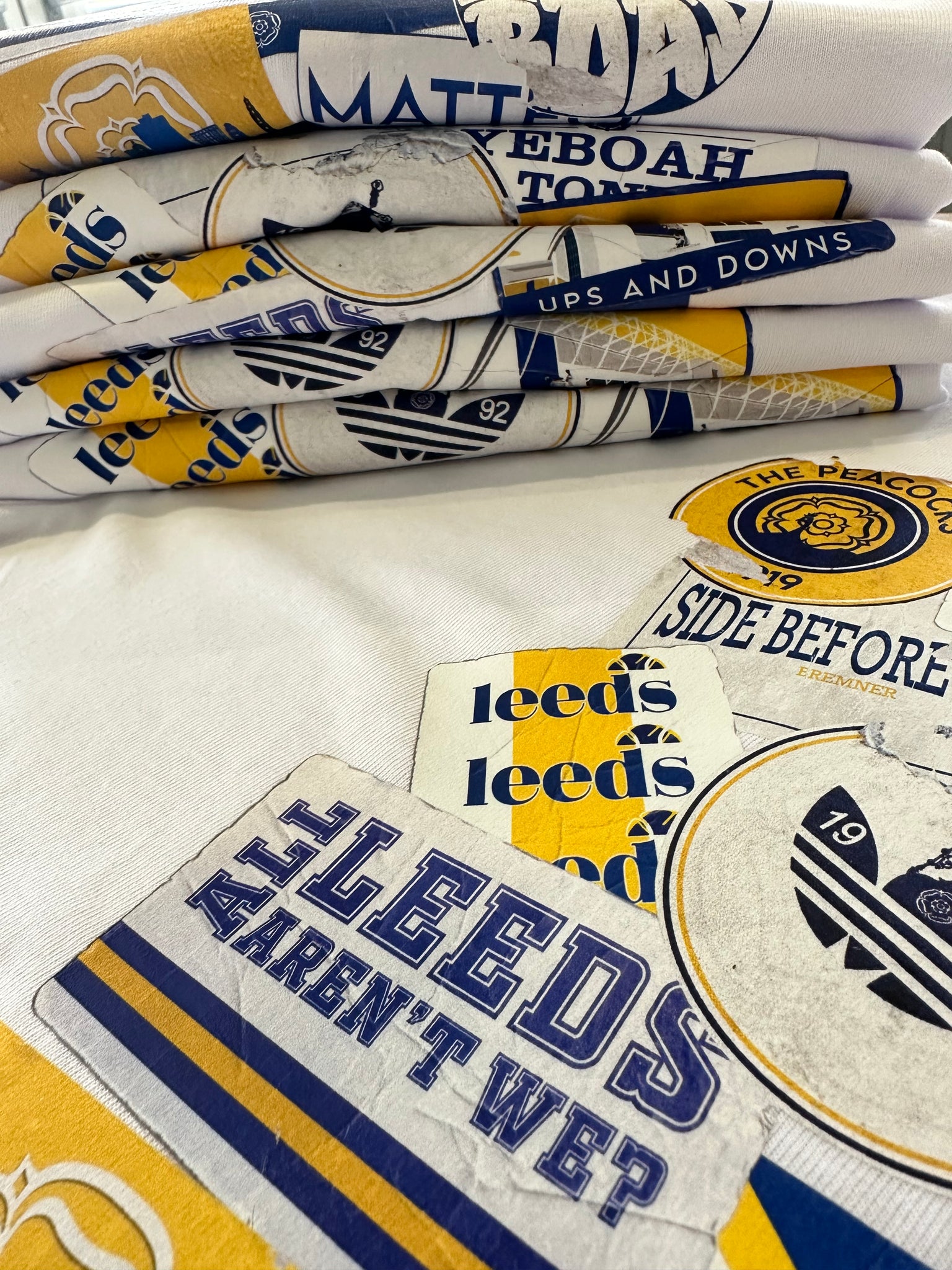 This Leeds United away day sticker print tee celebrates the history and moments of the club through sticker print designs you’d associate and experience on a man away day across the country.