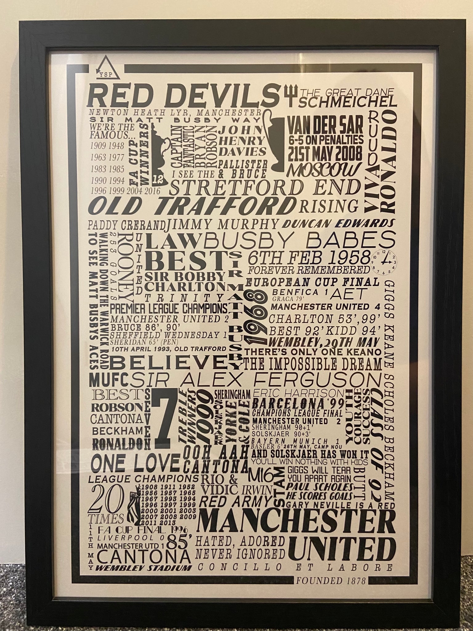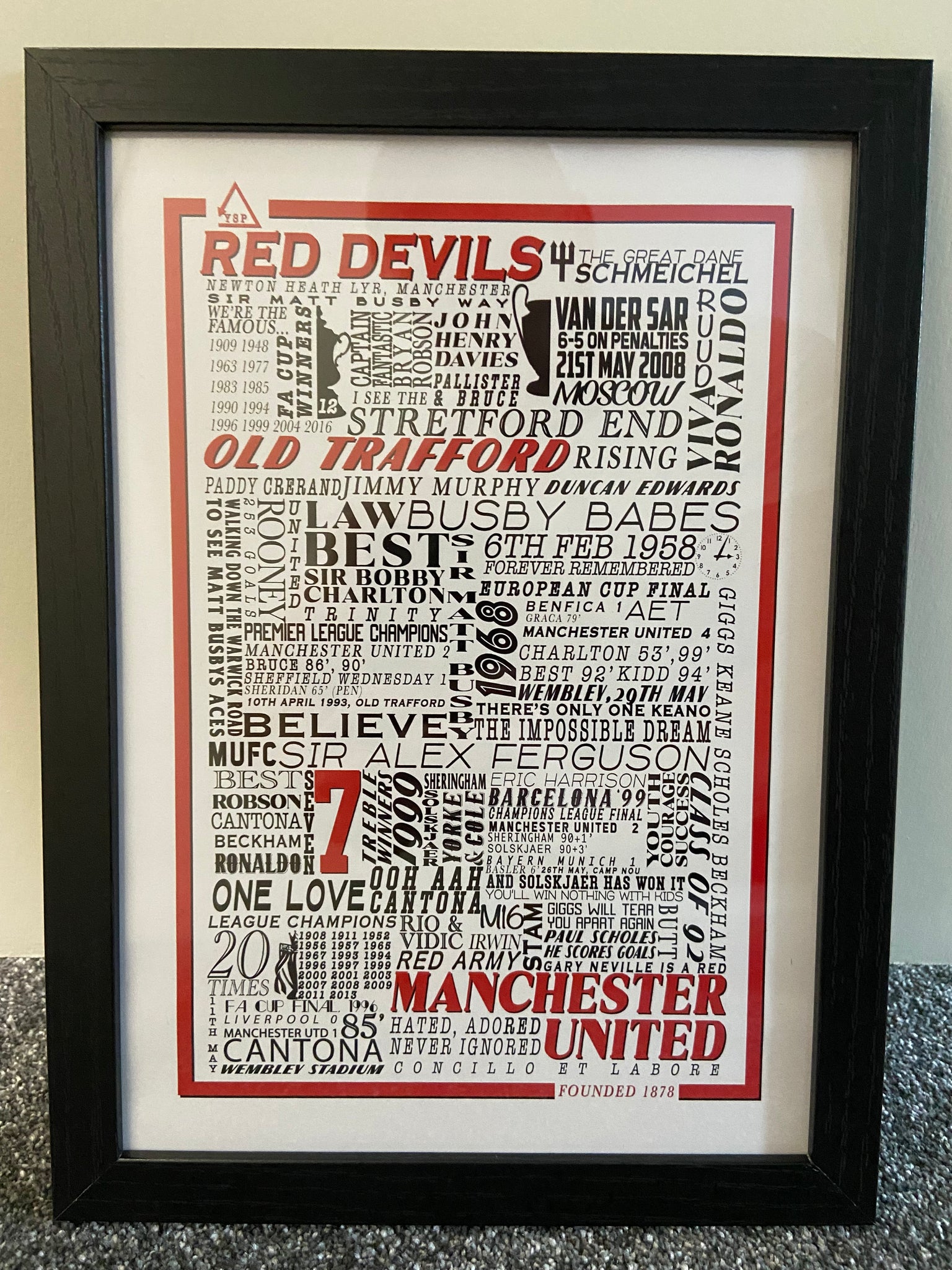 A perfect gift for Christmas, Birthdays or Fathers Day for a United fan to proudly hang on the wall.