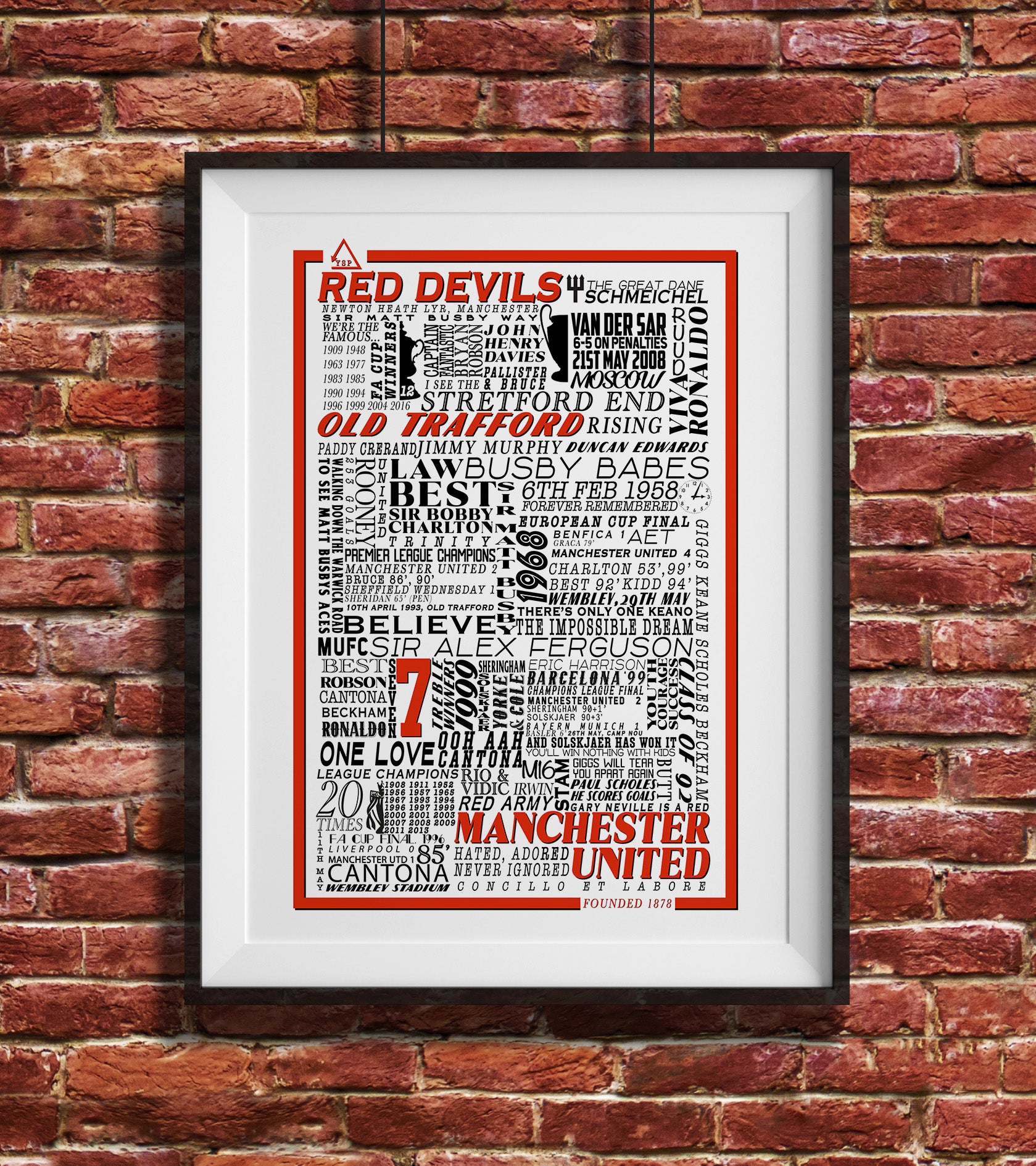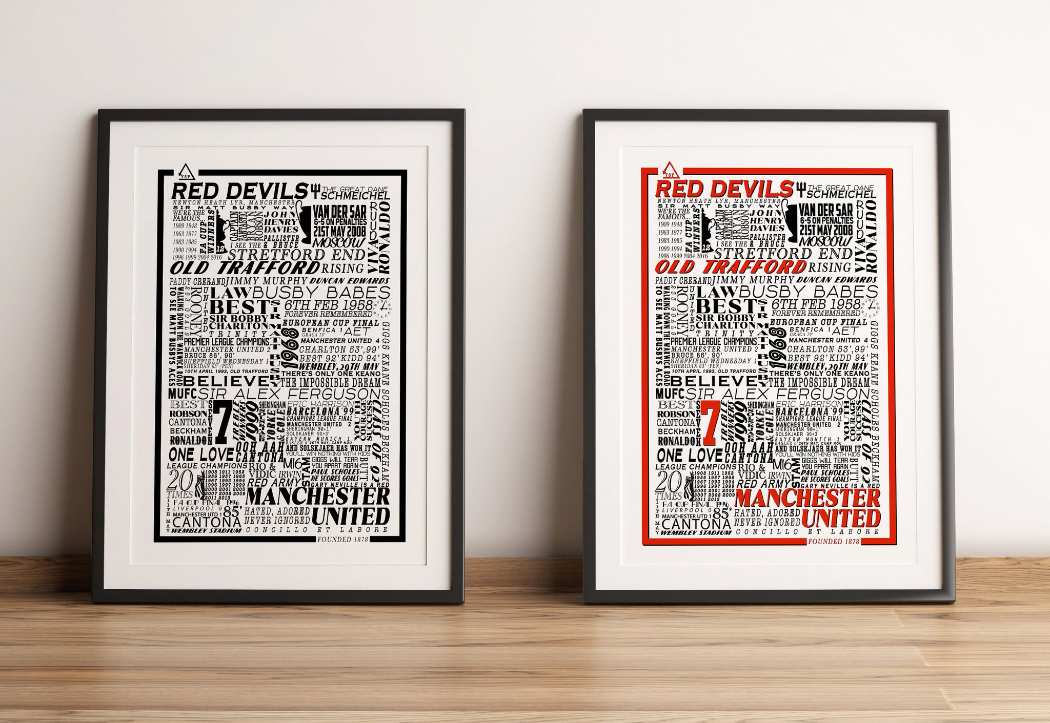 This Manchester United Football History Print celebrates the rich history of Manchester United Football Club and their story. Honours won, classic matches, unforgettable moments, fan favourite players, club legends and successful managers throughout the years.