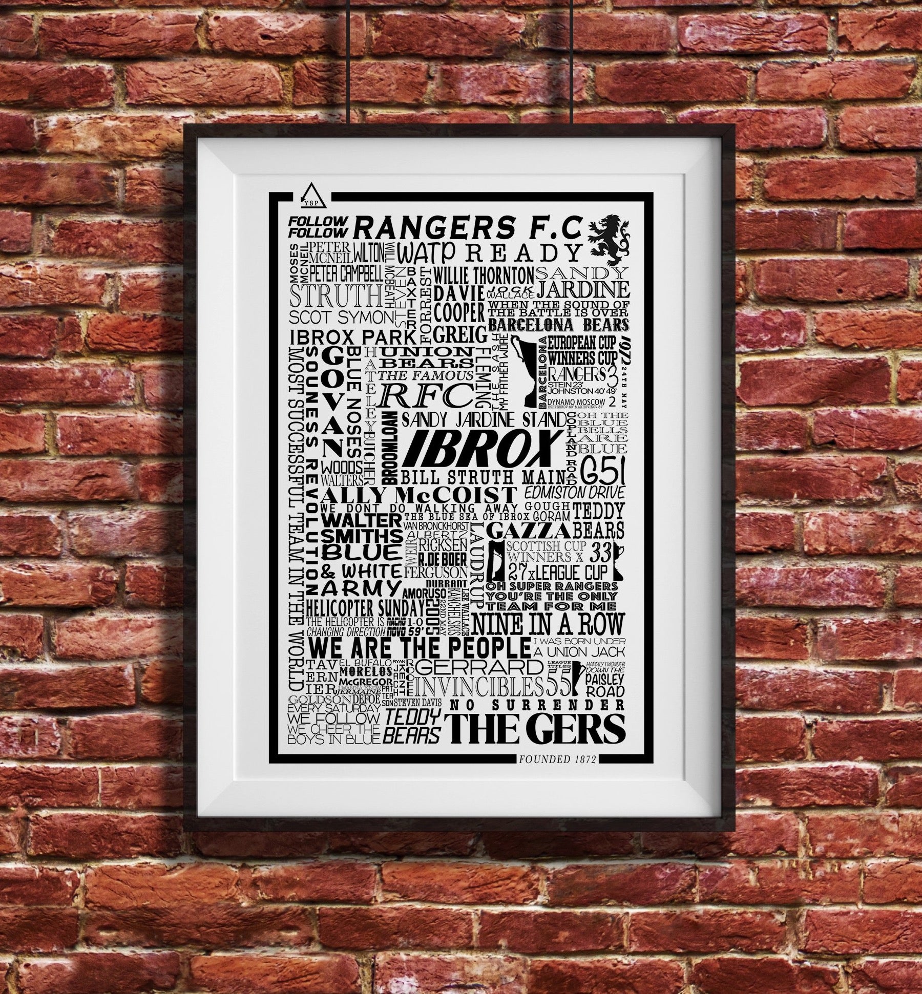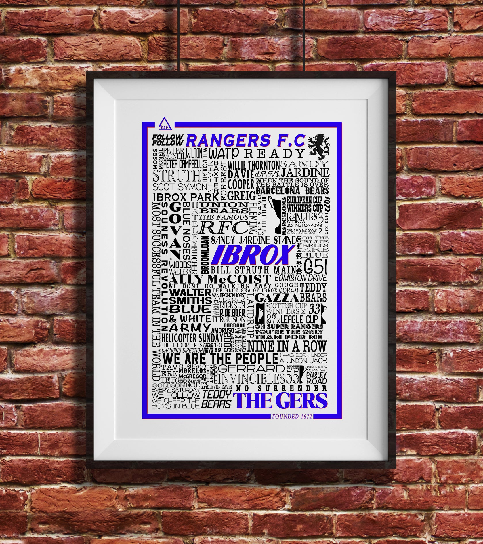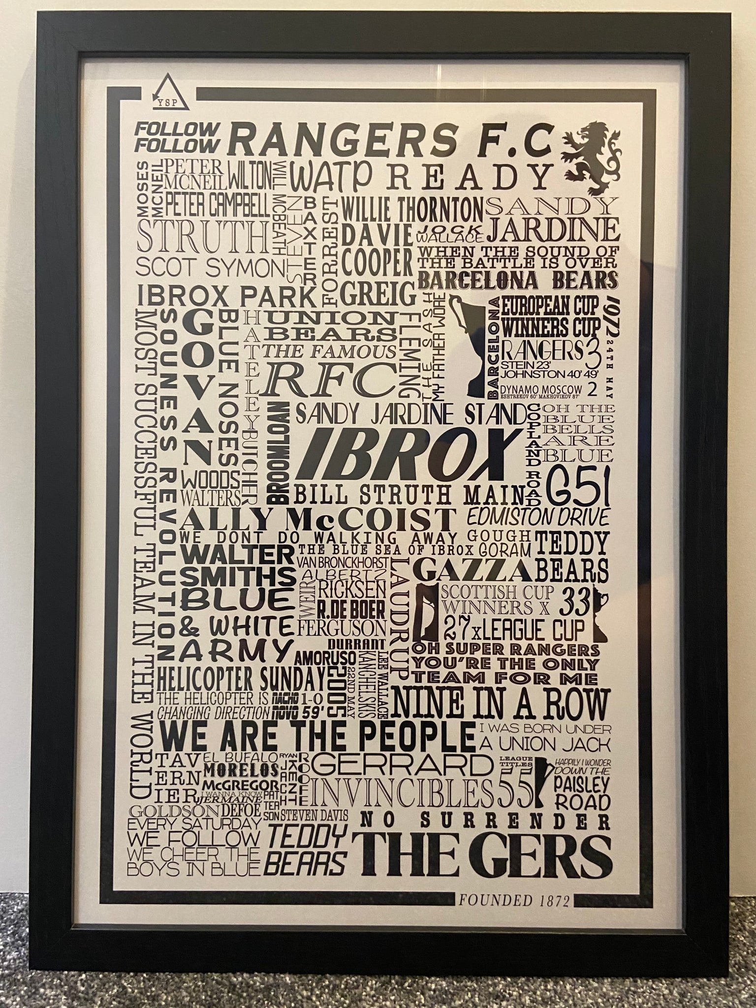 A perfect gift for Christmas, Birthdays or Fathers Day for a Rangers fan to proudly hang on the wall.