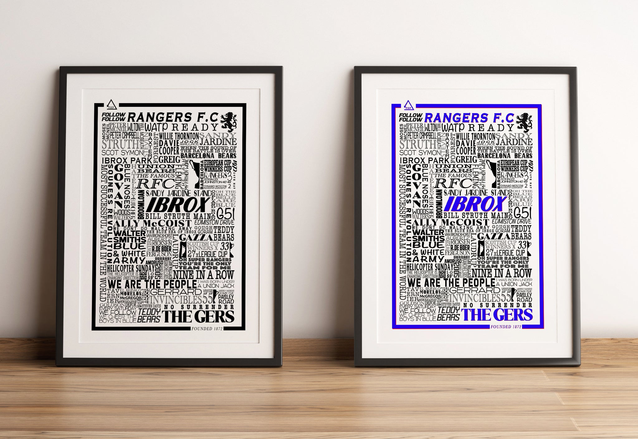 This Rangers Football History Print celebrates the rich history of Rangers Football Club and their story. Honours won, classic matches, unforgettable moments, fan favourite players, club legends and successful managers throughout the years.