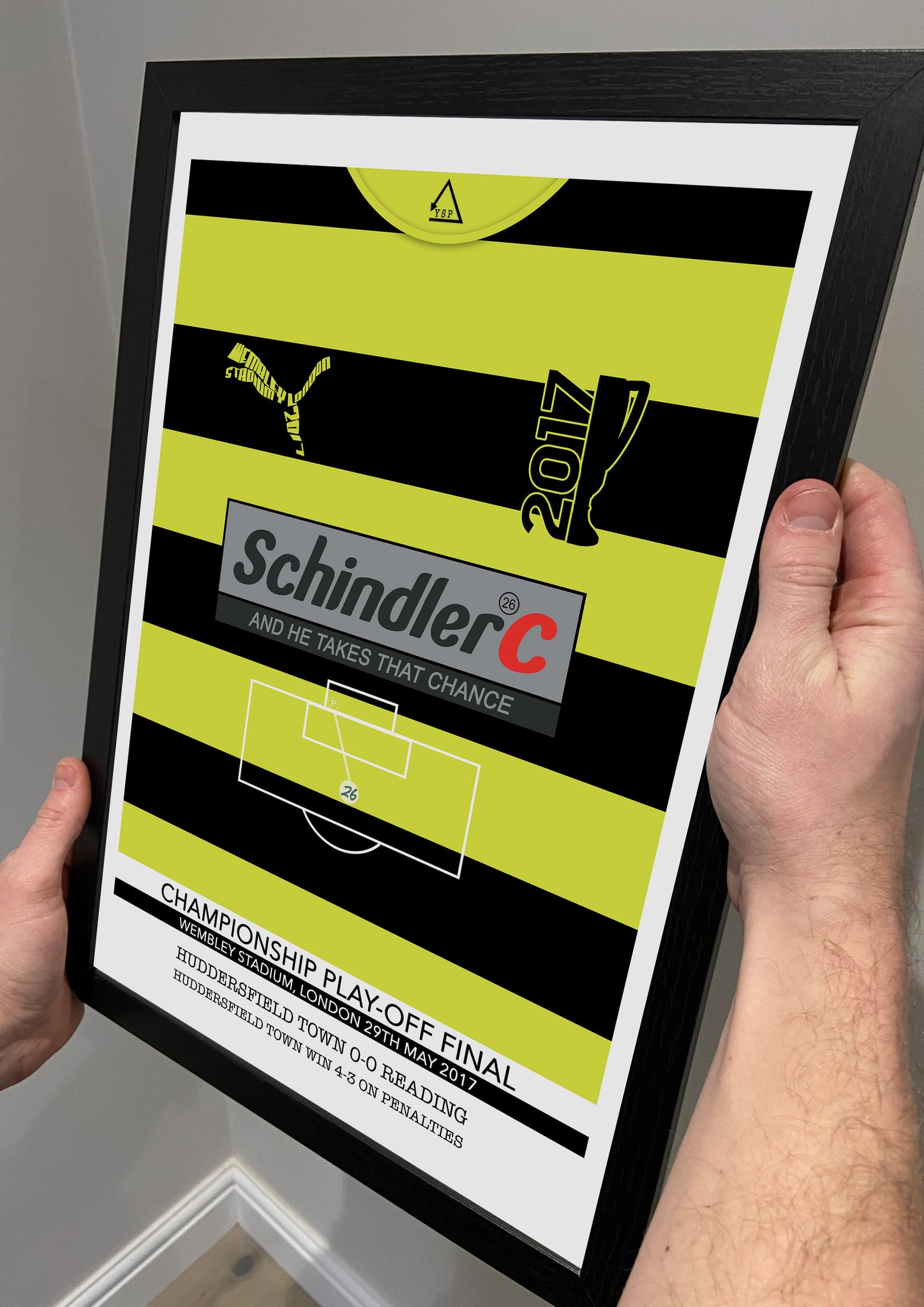 This Huddersfield Town shirt print uniquely celebrates Christopher Schindler’s penalty in the 2017 play off final to send Huddersfield Town to the Premier League.