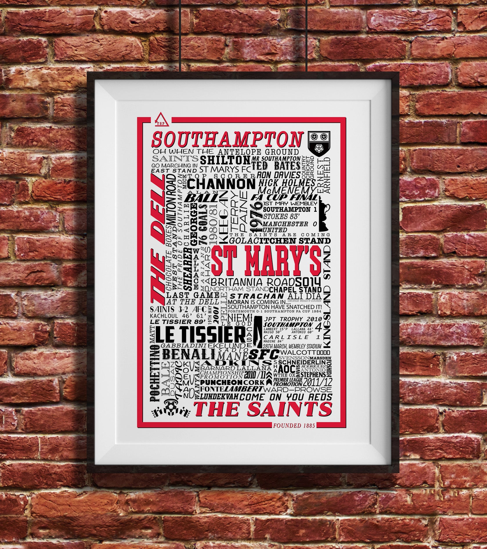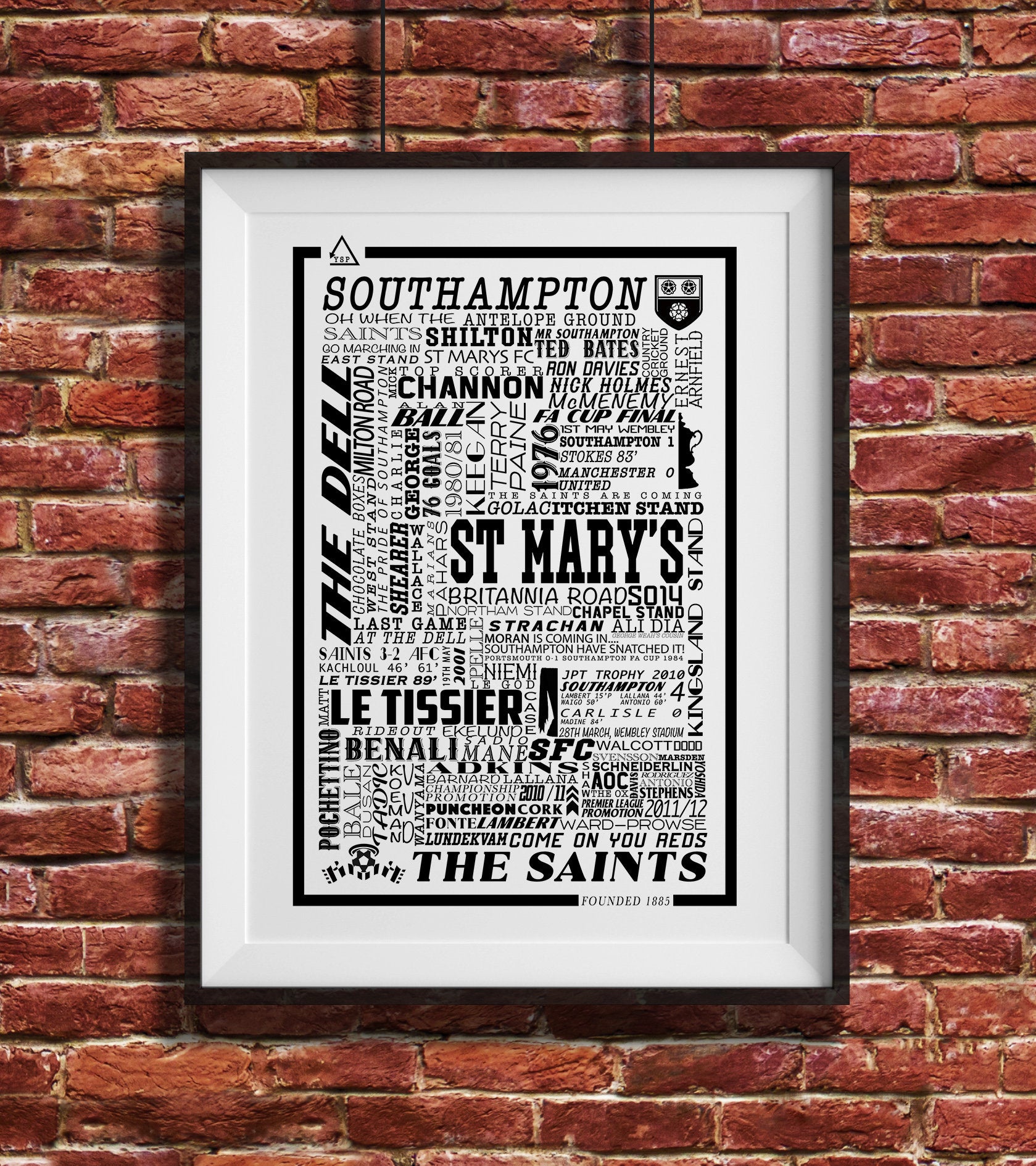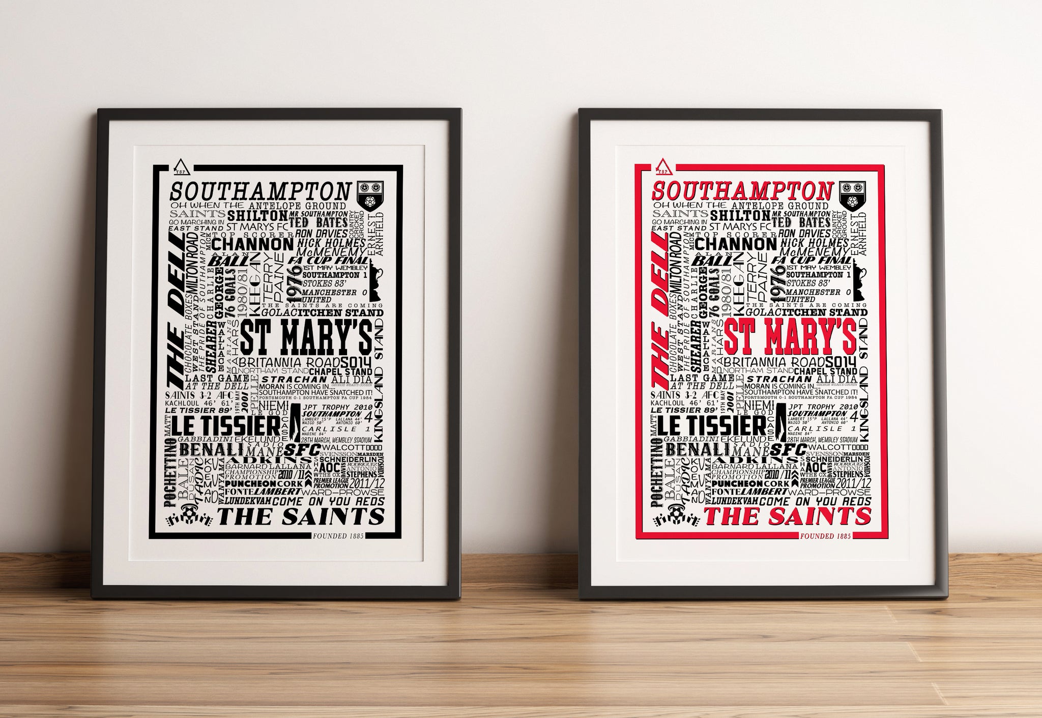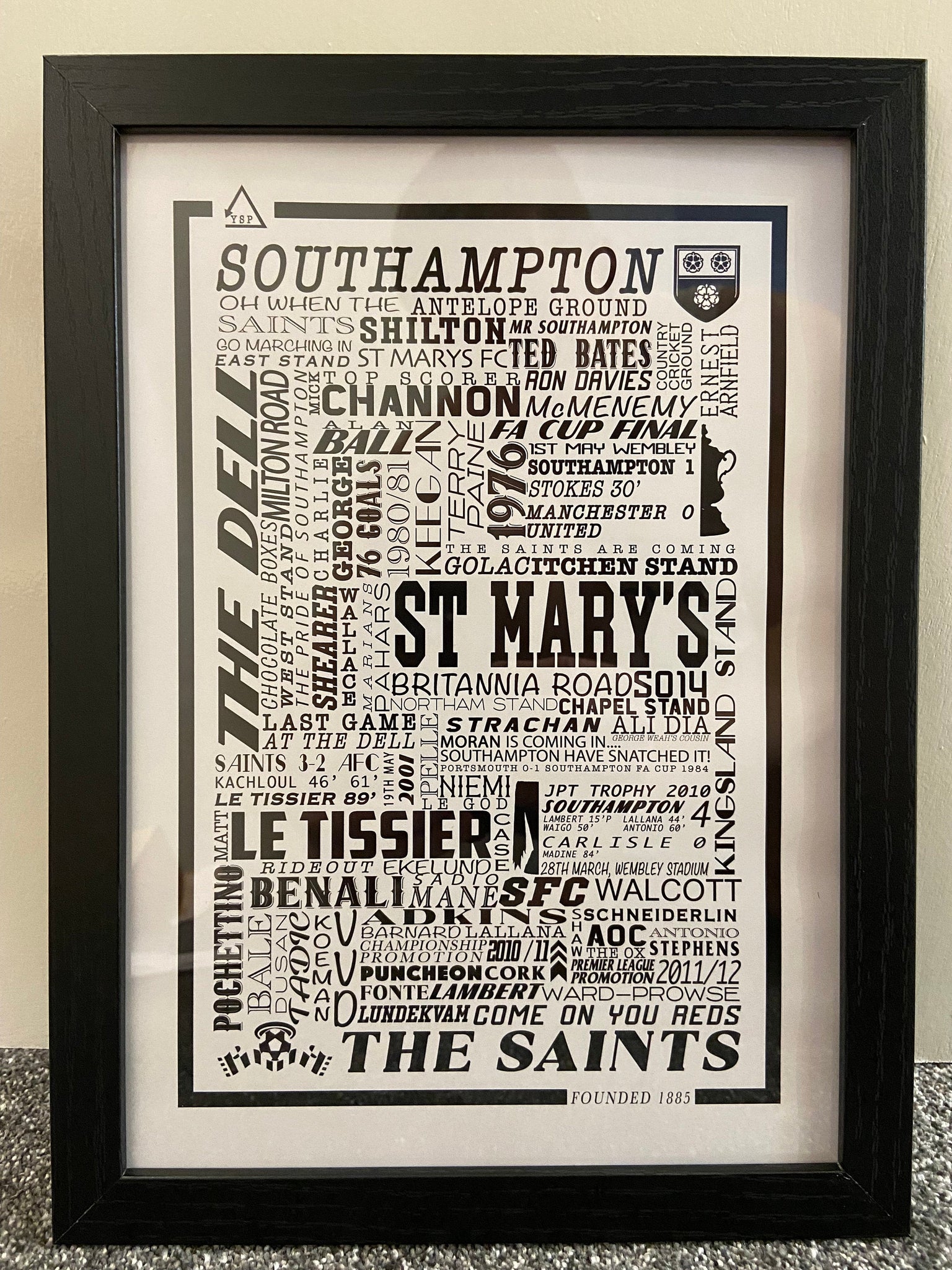 This Southampton Football History Print celebrates the history of Southampton Football Club and their story. Classic matches, unforgettable moments, fan favourite players, club legends and successful managers throughout the years.